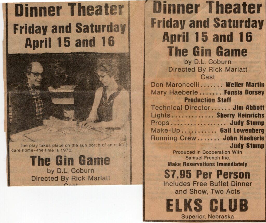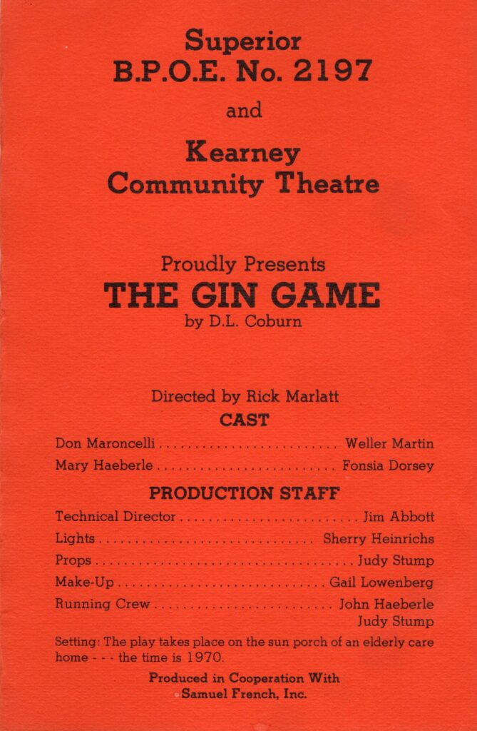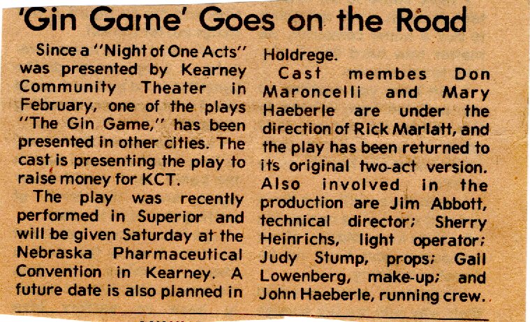 We performed this show at the KSC Experimental Theatre for A Night of One Acts. The other one acts were The Ugly Duckling and The Lesson. Tickets were $5.00 for adults and $3.50 for students and senior citizens. Gin Game won the competition and we took the show on the road, performing at the Elks Club in Kearney as well as in Red Cloud, Nebraska. We also performed at the Nebraska Pharmaceutical Convention when they held their first meeting in out-state Nebraska, and since John was a pharmacist, this was especially fun for us.
