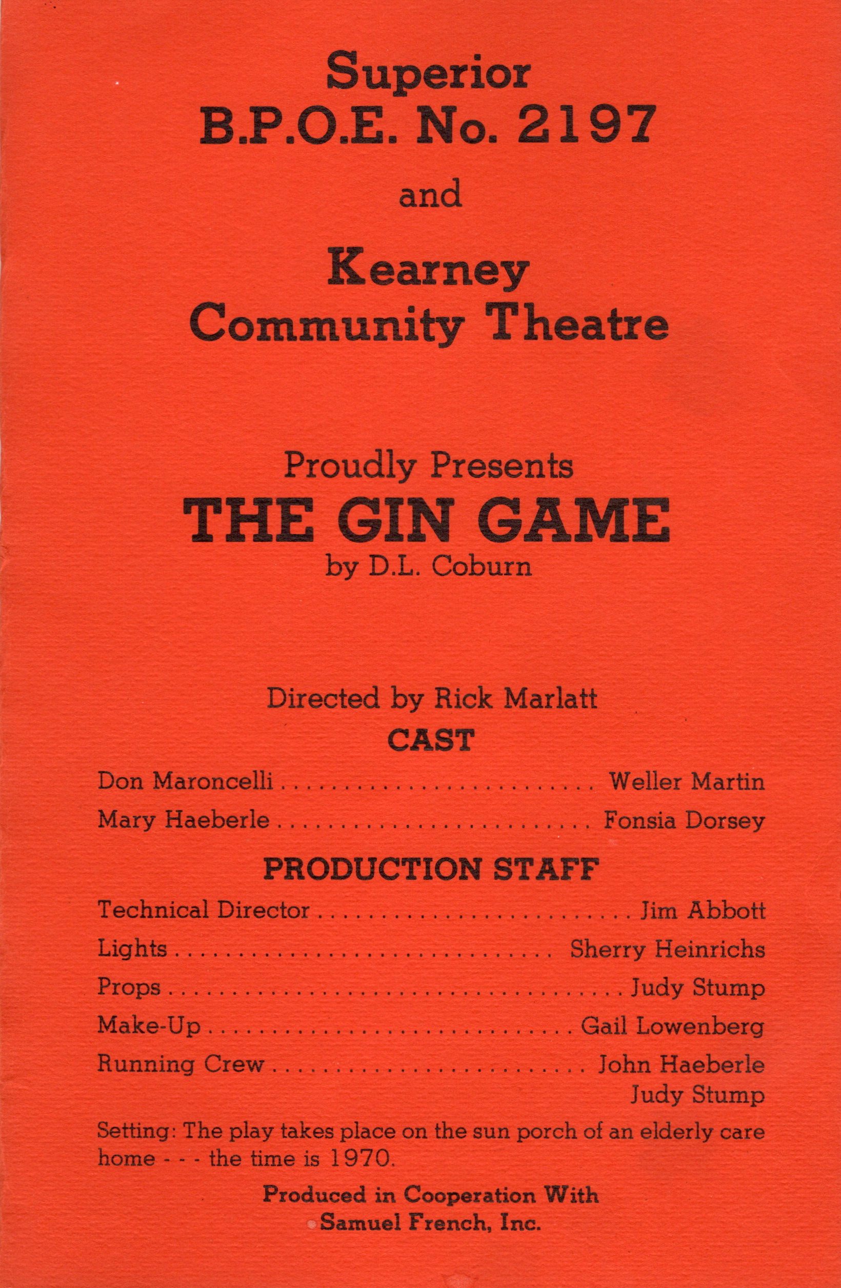We performed this show at the KSC Experimental Theatre for A Night of One Acts. The other one acts were The Ugly Duckling and The Lesson. Tickets were $5.00 for adults and $3.50 for students and senior citizens. Gin Game won the competition and we took the show on the road, performing at the Elks Club in Kearney as well as in Red Cloud, Nebraska. We also performed at the Nebraska Pharmaceutical Convention when they held their first meeting in out-state Nebraska, and since John was a pharmacist, this was especially fun for us.